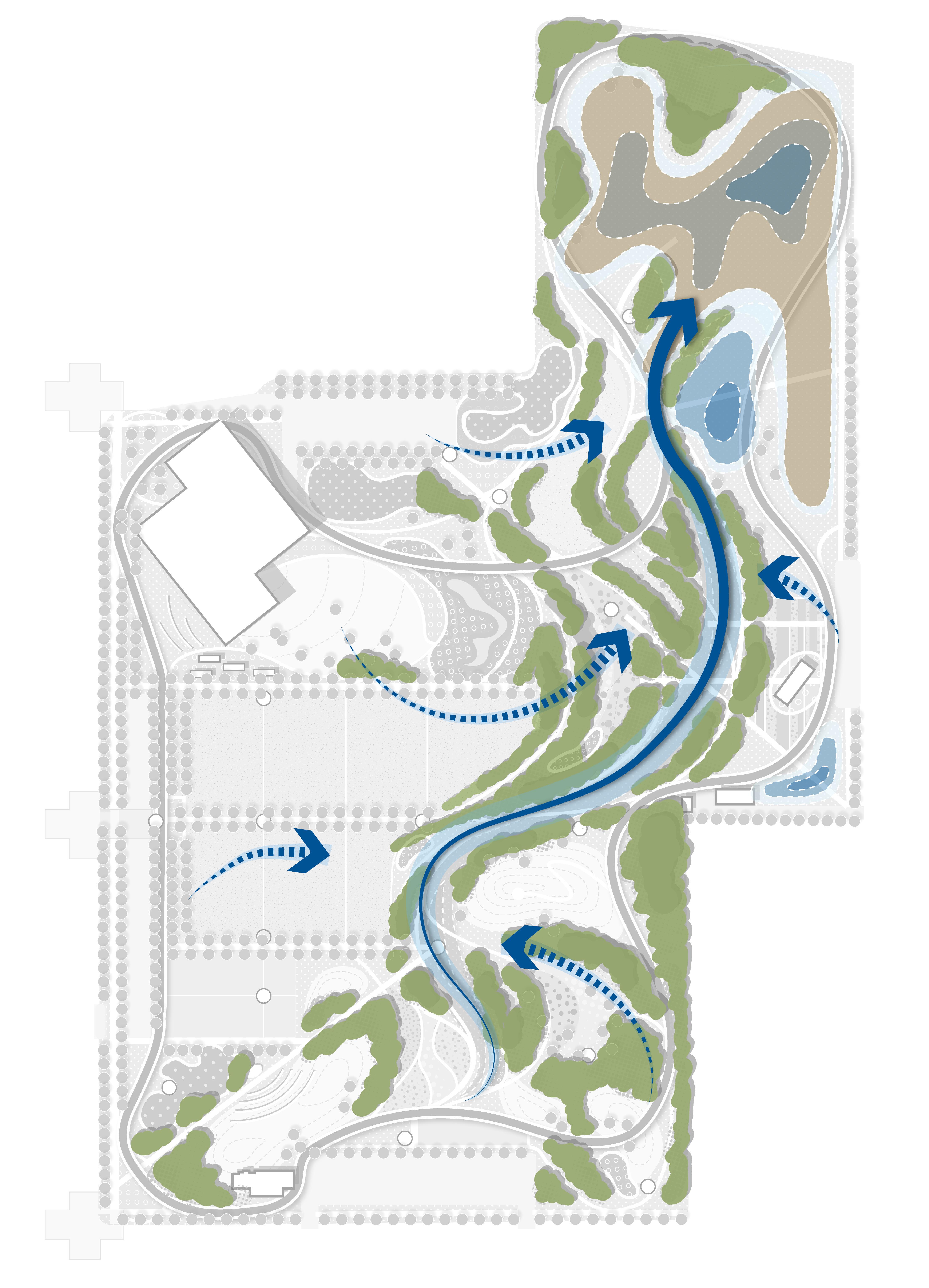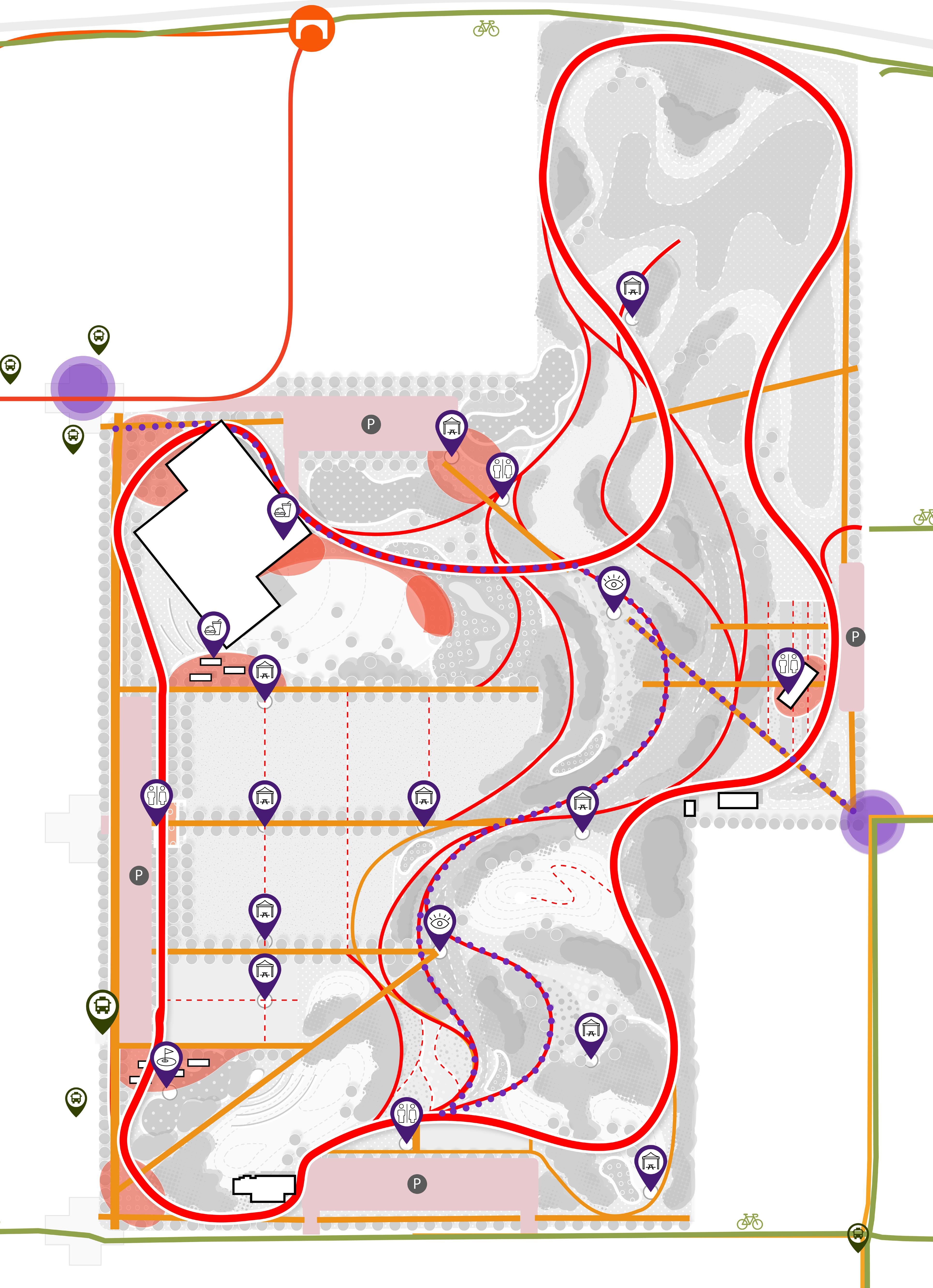Un circuito de circulación principal conecta todas las experiencias y áreas de programas clave dentro del parque.