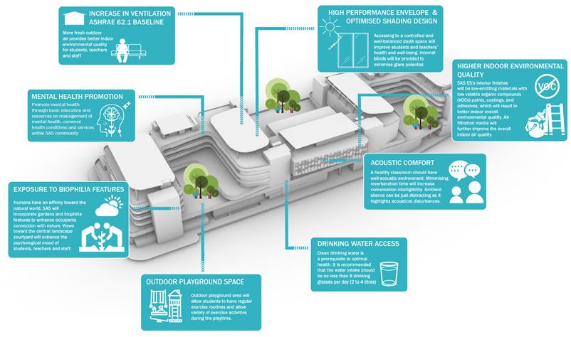 Biophilic design, good air quality, natural light, and acoustics are part of the SAS Reimagined design process. The aim is to contribute to overall well-being of our students and educators and offer enhanced learning experiences. SAS has also implemented standards like WELL and the Living Building Challenge to go beyond energy and water efficiency. Factors affecting wellness, such as acoustics, carbon footprint reduction, and even choice of materials, have been taken into considerartion throughout the design process.