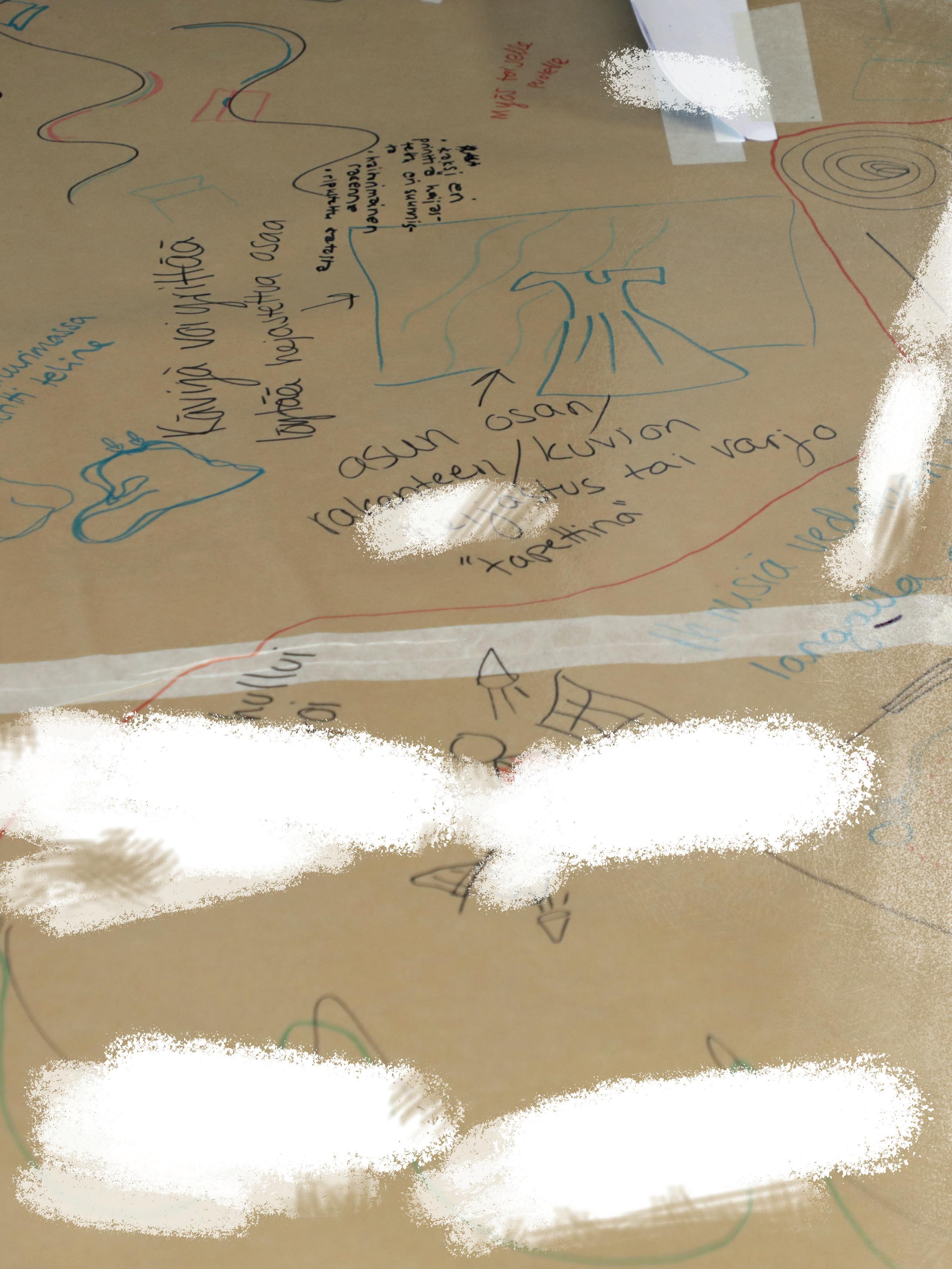 - Olemme käyäneet luovia ideointimenetelmiä ja näiden yhteistä purkua ryhmässä keskustelemalla. Ollaan myös piirrey ideoita koko luokkahuoneen lattian kokoiselle paperille.