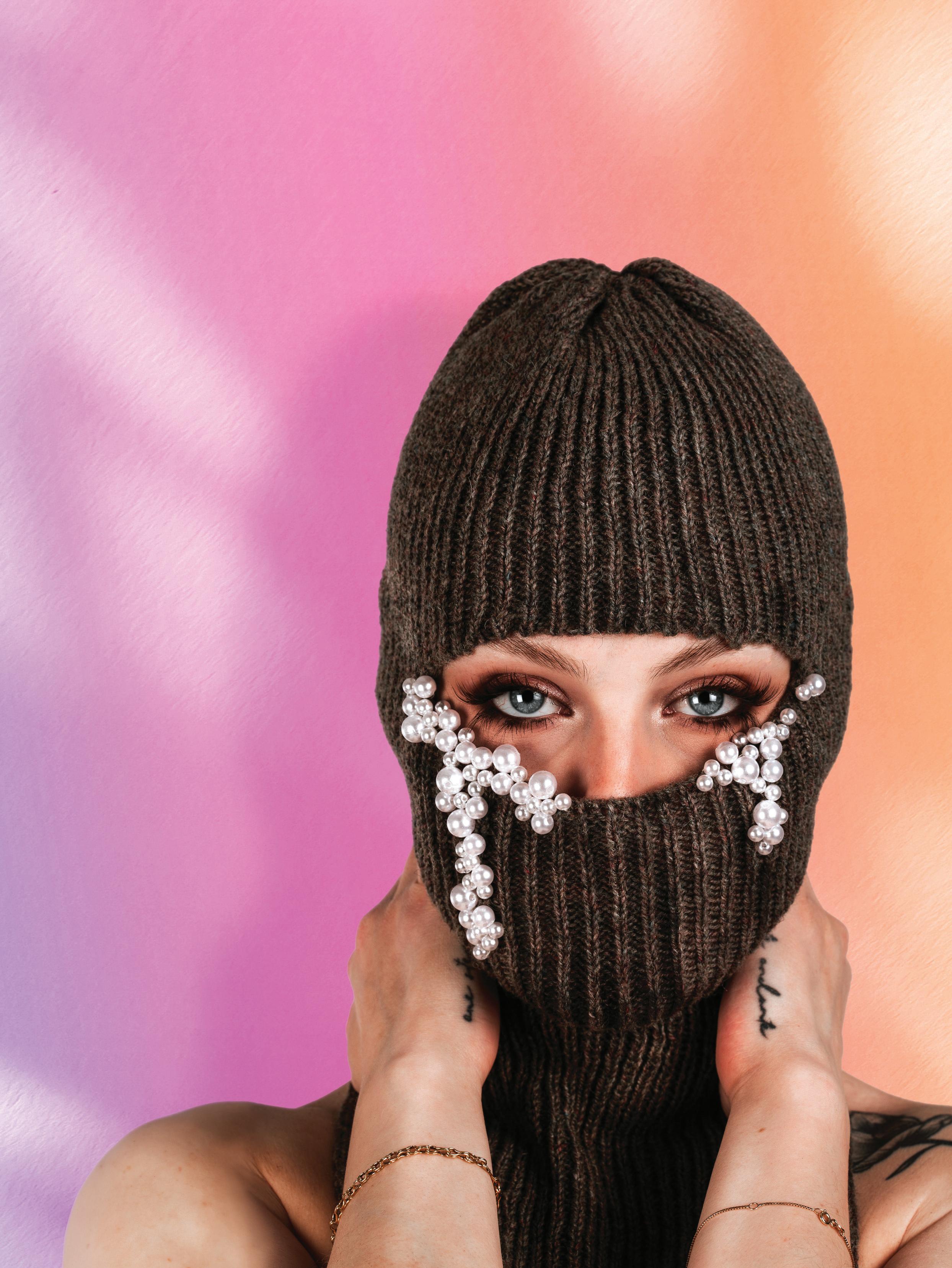 - Olen itse kärsinyt mielenterveysongelmista, joten haluan käsitellä aihe a myös töieni kaua. Neuleasuun hain inspiraatiota netistä ja pyysin ihmisiä kuvailemaan yhdellä sanalla, miltä mielenterveysongelmat näyävät. Sain sieltä hyviä ideoita. Lopputulokseen hain pimeyttä, synkkyyä ja peiävyyä. Tumma väri saatiin värjäämällä langat marja-aronialla. Pipon helmet kuvastavat kyyneleitä, hän kuvailee.