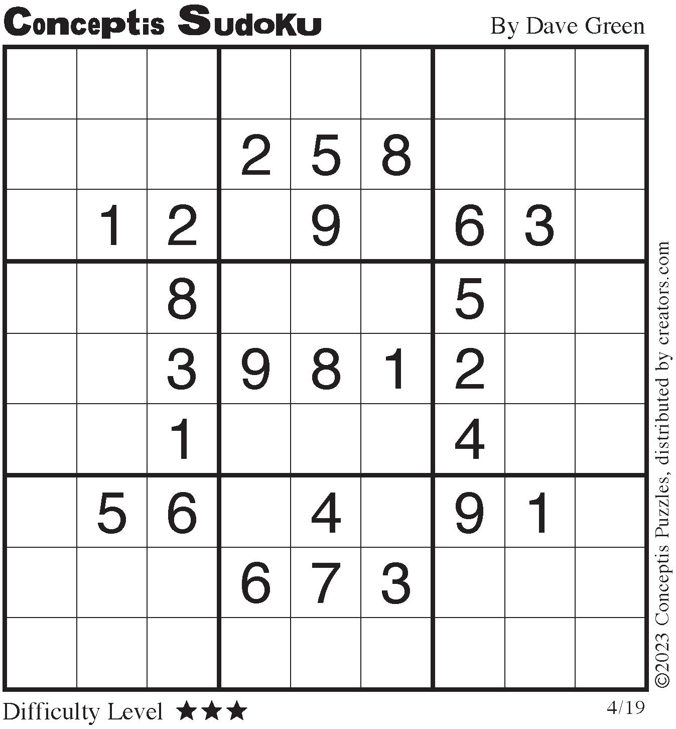 Fill in the grid so every row, every column and every 3-by-3 grid contains the digits 1 through 9. that means that no number is repeated in any row, column or box. Sudoku puzzles appear on the Diversions page Monday through Saturday.