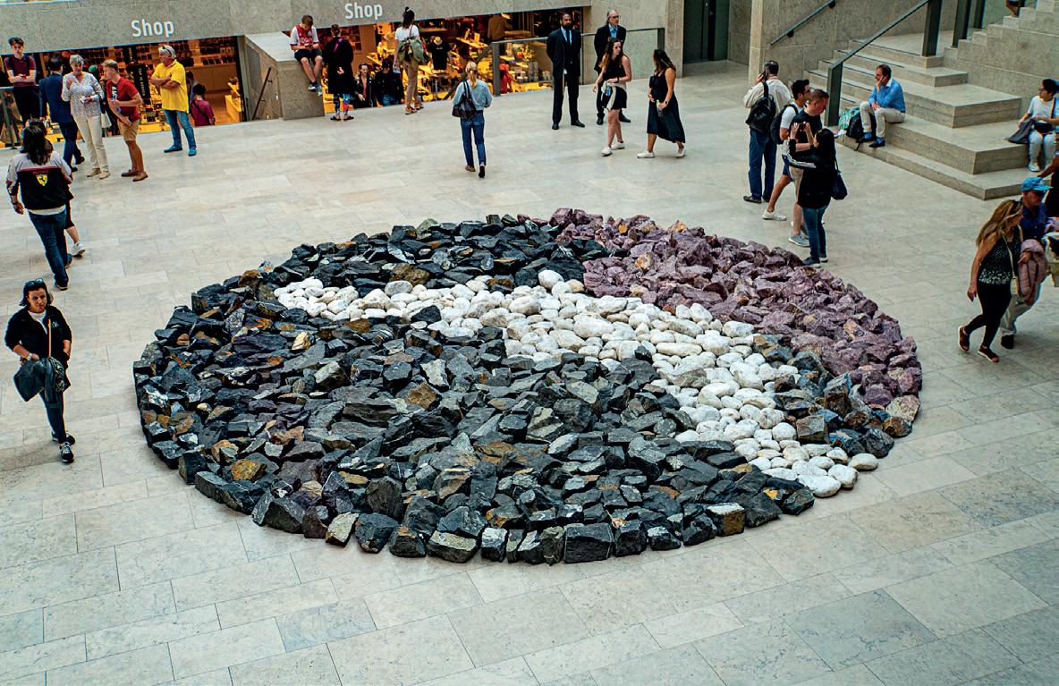 In addition to the works in grass, Long created two sculptures in the gardens from boulders carried by the Maas River to its North Sea estuary near Rotterdam. Two large-scale stoneworks inside the Rijksmuseum complete the exhibition. In the Great Hall, red Indian stones meander across the floor mosaic designed by museum architect Pierre Cuypers in River of Stones 2023, echoing a 2021 work Long created in Jaipur, India. On an atrium floor, Black White Blue Purple Circle is clearly visible from the covered passageway that crosses through the museum.