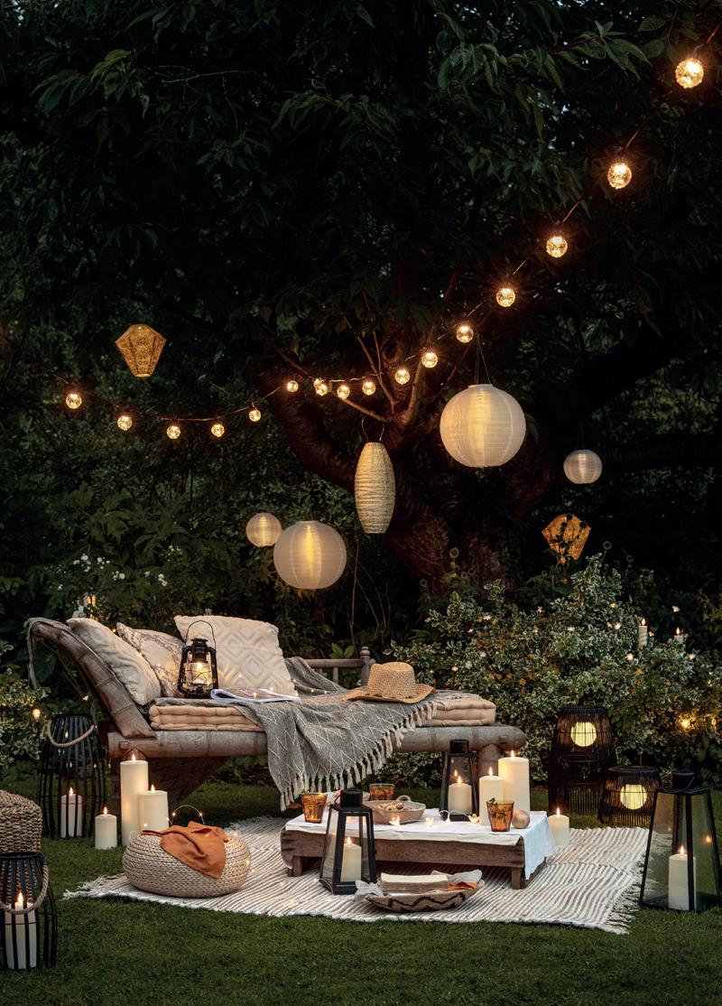 Lighting can really make or break a garden setting. Choose whimsical fairy lights and small lanterns for a cosy look. Battery lantern £19.99, outdoor fairy lights £7.99 and black wicker solar lantern bundle £99.99. www.lights4fun.co.uk/collections/summer-evening