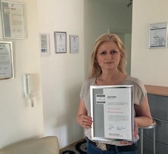 Geschäftsführerin Martina Schwandt vor der Award-Wall mit einer erneuten Auszeichnung.