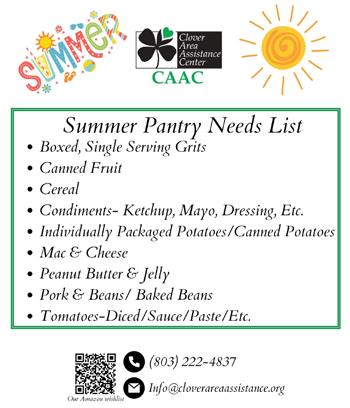 Clover Area Assistance Center needs your help! The food items listed are desperately needed for summer donations. Dropoffs can be brought to 1130 Highway 55 East, Clover. Call 803-222-4837 for more information.