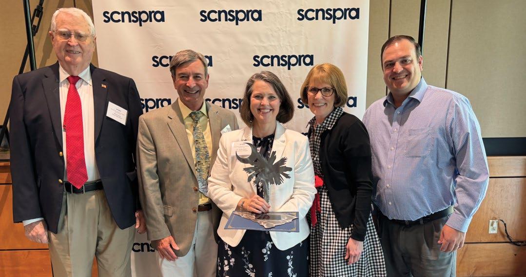 The Roaring Eagle student-produced newspaper received the Medallion Award from the South Carolina Chapter of the National School Public Relations Association. Editor-in-Chief Dr. Kelly Clark delivered a brief presentation on the project and paid tribute to Dick Lewis and Phil Weiss of the River Hills/Lake Wylie Lions Club for their sponsorship of the newspaper.