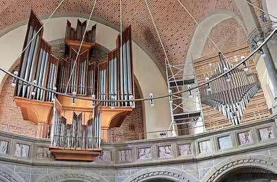 Die ursprüngliche Orgel der Markuskirche von 1906, die eine romantische Klangfarbe hatte, wurde im Zweiten Weltkrieg beschädigt.1958wurdeeineneueOrgelmitbarocken Klängenerbaut.UmdieromantischenKlänge wiederindieKirchezurückzubringen,sollte die bestehende Orgel erweitert werden. Für die Erweiterung, dem sogenannten Auxiliar,hatderOrgelbauerdiePfeifeneiner Orgel von 1906 aus Hildesheim aufbewahrt undwiederverwendet.DieseseilautderKirchengemeindeein„Schwesterinstrument“der ursprünglichenOrgelundzeitgleichinderselben Werkstatt von Furtwängler & Hammer erbautworden.DieserBetriebwardasVorgängerunternehmenvonE.Hammer,denSchloetmannheutemitneunMitarbeitendenführt. „DerKernteildesAuxiliarsbestehtausder alten Hildesheimer Orgel, das sind rund 60 Prozent“,erklärtderOrgelbauer.DieAußenverkleidungdesInstrumentswurdeneuaus Eiche gebaut. Um der Konstruktion mehr Lebendigkeit zu verleihen, hat der in dem OrgelbaubetriebbeschäftigteTischlerBretter inunterschiedlichenStärkenverwendet.„Die HolzstrukturerzeugteinlebendigesSpielmit dem Licht“, beschreibt Schloetmann. DerNeubau Im Innern der neuen Orgel, die durch eine kleine Tür begehbar ist, riecht es nach frischem Holz. 1.060 Pfeifen werden hier verbaut. Vom Kirchenschiff aus sind nur 42 Pfeifen an der Vorderseite des Neubaus zu