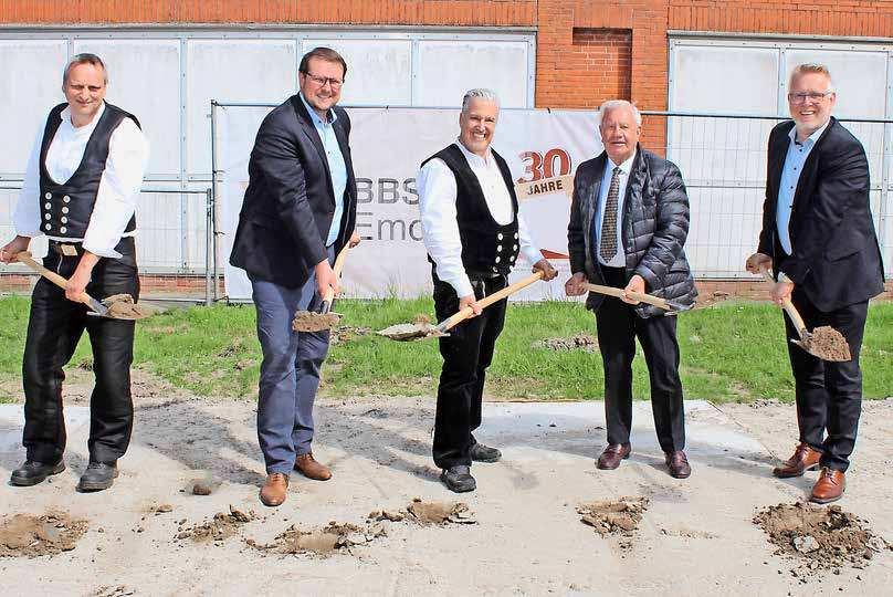 Den symbolischen ersten Spatenstich setzten (v.l.): Obermeister Lothar Heuermann, Emdens Oberbürgermeister Tim Kruithoff, Vorsitzender des Fördervereins Andreas Köhn, der ehemalige Obermeister Horst Dornieden und der Schulleiter der BBS II in Emden Björn Holzgrabe.