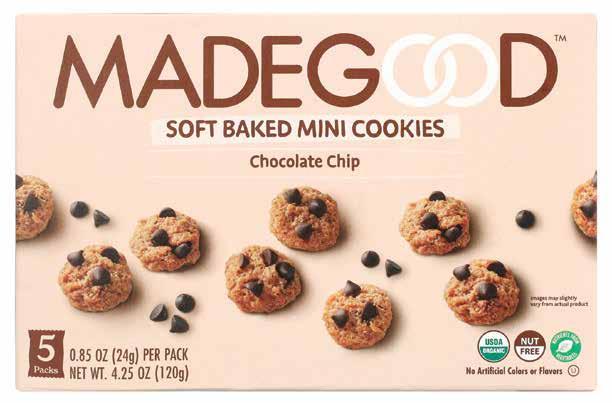 MadeGood Chocolate Chip Soft Baked Mini Cookies are thoughtfully created to keep the familiar taste of chocolate chip cookies while also creating an organic product free from nine common allergens, artificial colors, or flavors. Soft-baked and bite-sized, these are a delicious alternative to regular overprocessed cookies. They are available at most retail stores and at madegoodfoods.com.