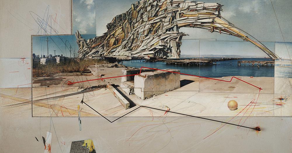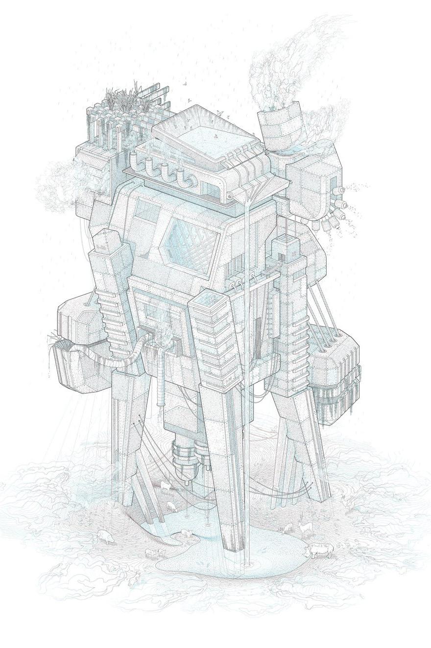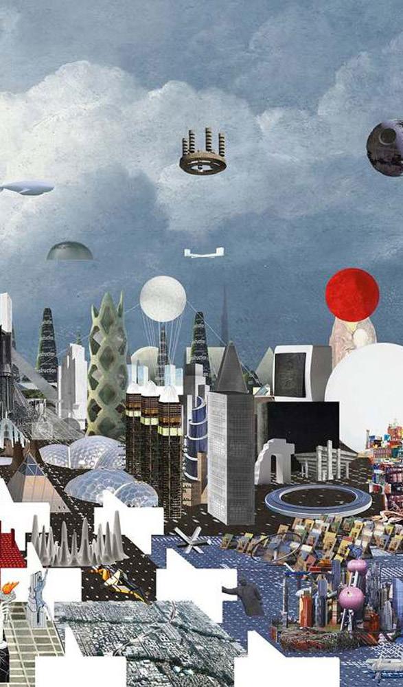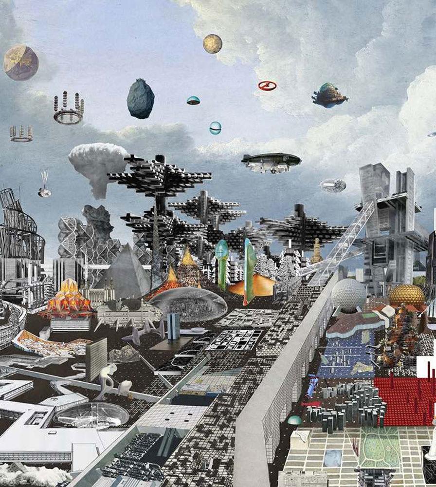 Traversing the ocean, the units of Herron's Walking City represent a kind of technological utopianism—military submarines are combined with insectlike exoskeletons and periscoping legs. Each unit of the city contains a comprehensive set of urban resources. Linked by a superstructure of retractable corridors, they form an instant and itinerant metropolis. Here collage is used both to circulate an idea and to propose a new architecture of circulation: Herron’s work was disseminated through small magazines as image–based virtual architecture; the surreal elements of collage—simultaneous viewpoints, depth, and flatness—are instrumental to proposing a city that not only walks but adapts to endless change.