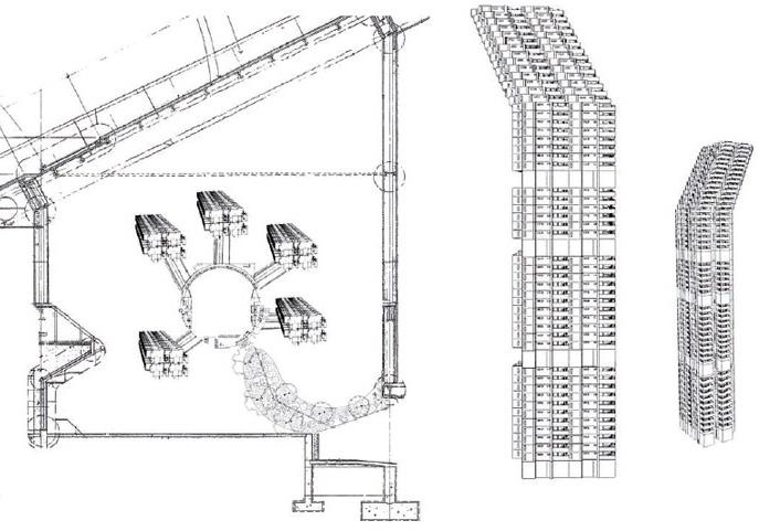 Hejduk’s entry develops some of the principles of his previous project “Berlin Masque” proposing an intervention which is meant to be developed over time, specifically over two thirtyyears periods, and become “A growing, incremental place – incremental time“. A central recurring theme of research in Hejduk’s projects of that period is the development of the concept of “Masques“: architectural structures embodying a character, specified more by the construction of relationships with other elements than by a specific identity and representing the problematic correlation between the human being and the symbols which he’s supposed to embody. All the projects related to the “Masques” intervene in places tied to a strong collective memory but laying in a state of abandon. Hejduk uses the tool of the project to revive the figures that inhabited a place by putting them in a relationship with the contemporary citizens and thus projecting the site towards its future.
