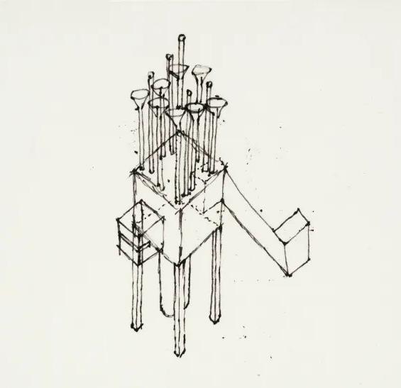Its name refers to the traditional New England form of the “widow’s walk”, a kind of belvedere on the roof of seafarers’ houses from which the captain’s wife could watch for her husband’s return or, after his disappearance, look longingly out to the merciless sea. In the book Hejduk published about this drawing, he imagines how the odd forms on the roof are made by the “Trombone-Maker, a craftsman of refined detail”.
