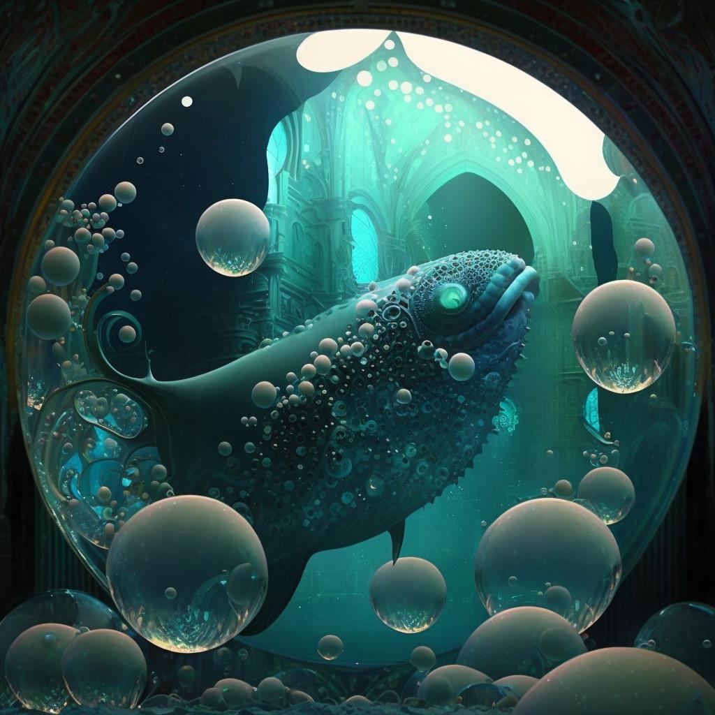 In the depths of the ocean, there lived a giant monster named Kun. Kun was unique in that it embodied the dreams of the people that inhabited the world above. The name Kun came from the fish roe, which represented the dreams of those people. When the people were content with their lives, Kun would transform into Peng, which would allow the human consciousness to transcend Earth and explore space. One day, a young woman named Sophie had a dream in which she found herself inside Kun's body. As she explored the spaces within the monster, she was amazed by what she saw. Everywhere she looked, there were intricate patterns and beautiful colors that seemed to shift and change with every passing moment. Sophie realized that each area within Kun reflected the dreams of the people above. She saw familiar landscapes and objects, and encountered people from her past. As Sophie continued to explore, she noticed that Kun's body was constantly shifting and changing. She could feel the rhythm of the ocean, and the ebb and flow of life itself. She realized that Kun was not just a monster, but a living embodiment of the dreams and aspirations of the people above. Alice continued to explore, and as she did, she began to understand the concept of optimistic nihilism. She realized that life had no inherent meaning, but that this didn't have to be a negative thing.
