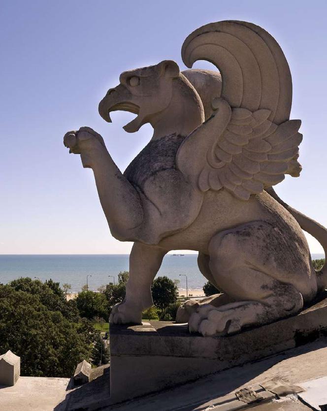 A griffin is a mythical creature. Griffin, or gryphon, comes from the Greek word for curved or hooked nose—grypos—like an eagle's beak. Bulfinch’s Mythology describes the griffin as having "the body of a lion, the head and wings of an eagle, and back covered with feathers." The combination of eagle and lion makes the griffin a powerful symbol of vigilance and strength. The use of the griffin in architecture, like the griffons atop Chicago's Museum of Science and Industry, is decorative and symbolic.