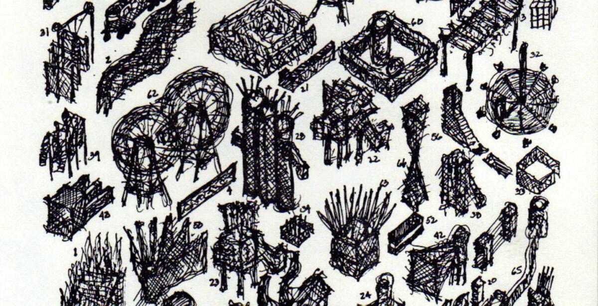 The project site of “Victims” is self-contained and enclosed through a double hedge marking its border. Visitors could either reach the site crossing a drawbridge over the hedge or taking