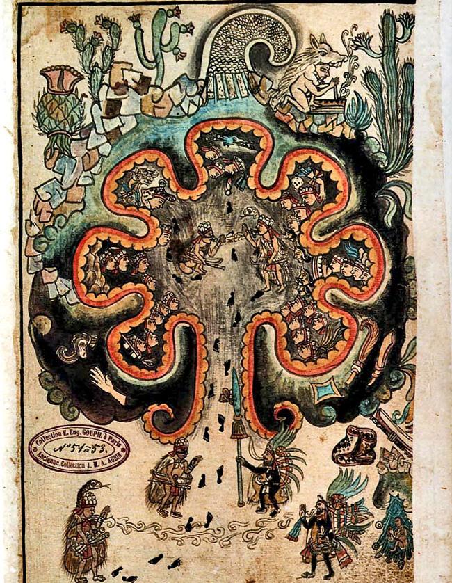 Chicomoztoc (“The Place of the Seven Caves” or “The Cave of the Seven Niches”) is the mythological cave of emergence for the Aztec/Mexica. As with other caves illustrated in Mesoamerican art, the cave has some animal-like characteristics, such as teeth or fangs and eyes. Chicomoztoc was not necessarily a specific, physical place but, like Aztalan, a widespread idea among many Mesoamerican people of a mythical cave as a place of emergence for both humans and gods, from which each group materialized and identified itself within their own sacred landscape.