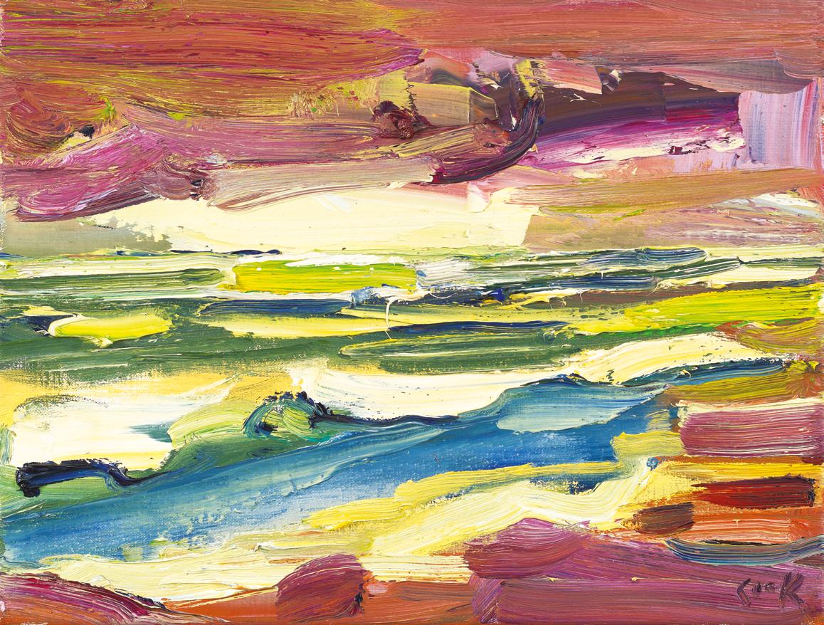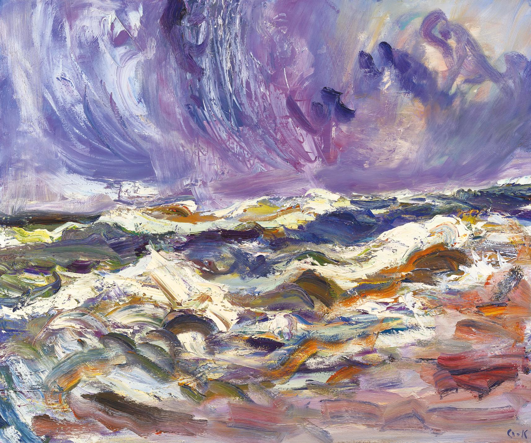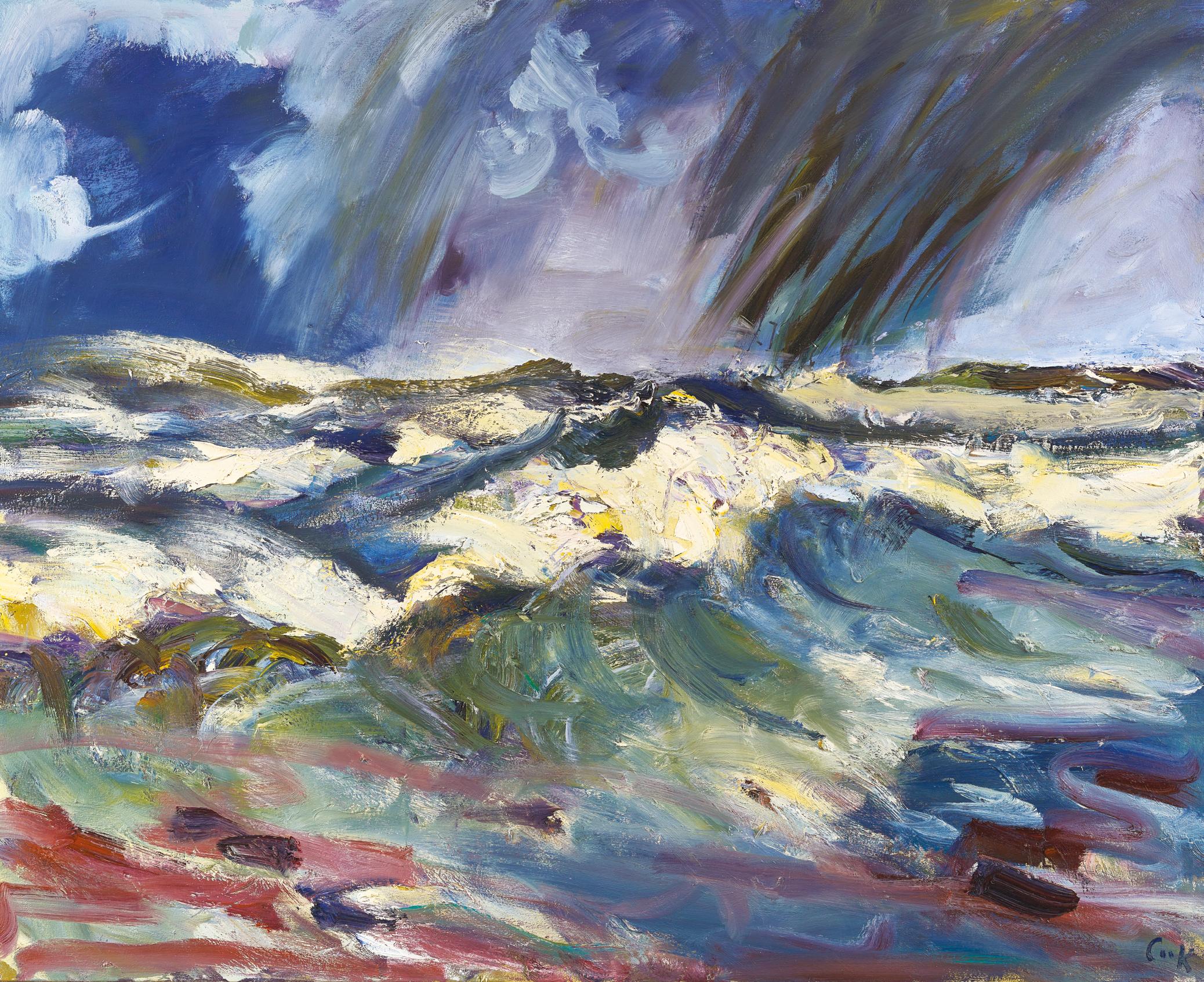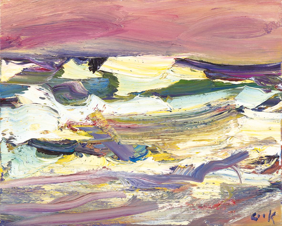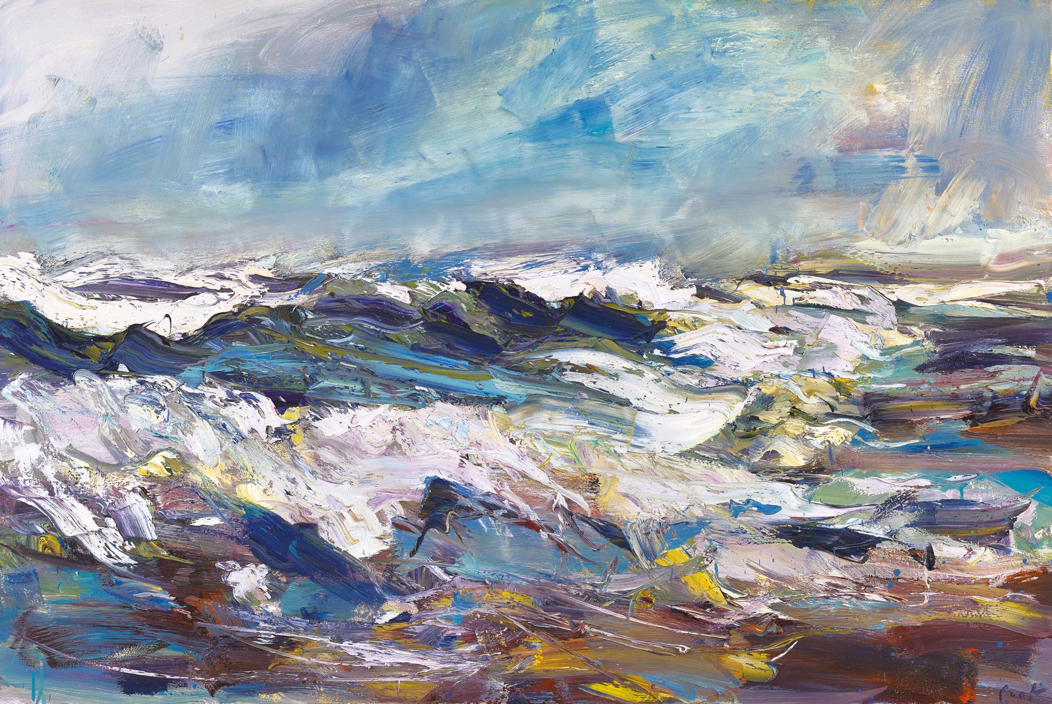 Cook has lived at Seagreens, perched on the edge of the Kincardineshire coast for close to 20 years. The sound of waves pervade his home and studio environment, and as the high tide mark sits just meters from his property, a strong easterly can coat his studio window with spume and salt. Whilst the sea has been a constant presence in his life, his recent bodies of work have been dedicated to single subjects. Change, Ripeness and Decay featured the industrial landscape of Fife, Earth Shaker in 2021 focused on the fecundity of his wild garden. This exhibition sees Cook return to the sea, his great muse, time allowing him to reengage fully with the subject. There are 55 paintings in this exhibition which chart the sea, temperamental weather and sky at Seagreens over the course of one year. It is the winter sea which Cook is particularly inspired by. He is an artist who revels in experiencing the visual and physical assault of a North Sea squall. Joan Eardley worked at Catterline, just 11 miles north of Seagreens. Like Eardley, 60 years before, Cook feels the emotional draw of the sea, and to create paintings that relay the intensity and immediacy of his lived experience. In Forged by The Sea, Cook realises the full potential of his visual language to make paintings which describe the raging forces and indifferent beauty of mother nature, paintings at once of the moment and eternal.