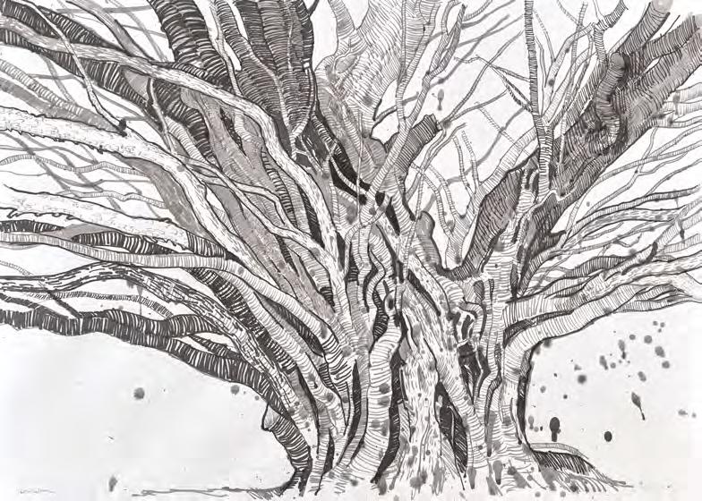 Deep in these ancient landscapes it’s possible to find the same intricate layering, complexity and sublime scale that has fascinated me in shipyards and oil rigs. The Eggardon Yew tree featured in this exhibition is over 2,000 years old. It’s an astonishing piece of natural architecture that extends across space but also deep through time. Many of the lessons learned whilst drawing industrial structures, equipped me to tackle this epic subject.