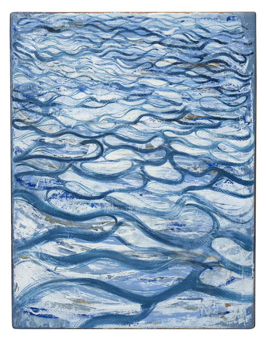 Light on Water leads on directly from my previous solo exhibition at The Gallery in 2019, Rising Horizon. That exhibition charted an ever-increasing horizon-line, from the bottom to the top of the canvas, providing commentary on the issue of sea level rise – one consequence of global heating. Painted onto a range of found objects, including some of a more industrial nature, each painting in Rising Horizon acted as a springboard for a wider discussion. The series opened with big skies and closed with paintings of mostly sea surface, their horizons well over head height. This exhibition continues the theme, with the main body of abstract paintings fully covered and without sky, many based on close-up wave formations. Just like Rising Horizon, there is a progressive quality to this new series, an exploration of proportionality. The paintings range from mostly dark in colour to mostly light. In some cases, the light represents sunlight, in other cases it could be sea ice, battling against the dark water beneath.