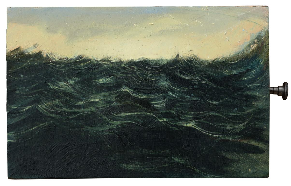 Other paintings look back to a time before global warming – before the Industrial Revolution – making subtle nods to the works of Old Masters (see p.50—57). In all, ten groupings make this show, mostly categorised by materials, each ranging in pace and tone. As ever, I’ve worked with recycled objects wherever possible, found at flea-markets and antique shops on my annual gathering expeditions. Light on Water features artworks made using pulleys, stamps, doors, tins, codfish boxes, matchboxes, cards, various types of board and canvas (including maps and bus blinds). The act of gathering is an important part of my artistic practice, perhaps as important as that of applying paint. The right surfaces must be found: functional and familiar, with a solid ground to work upon; yet unique enough to spark interest (in myself, and my audience). In this catalogue, the place each object was found has been added to the accompanying caption. These are places that I’ve lived or visited at regular intervals.