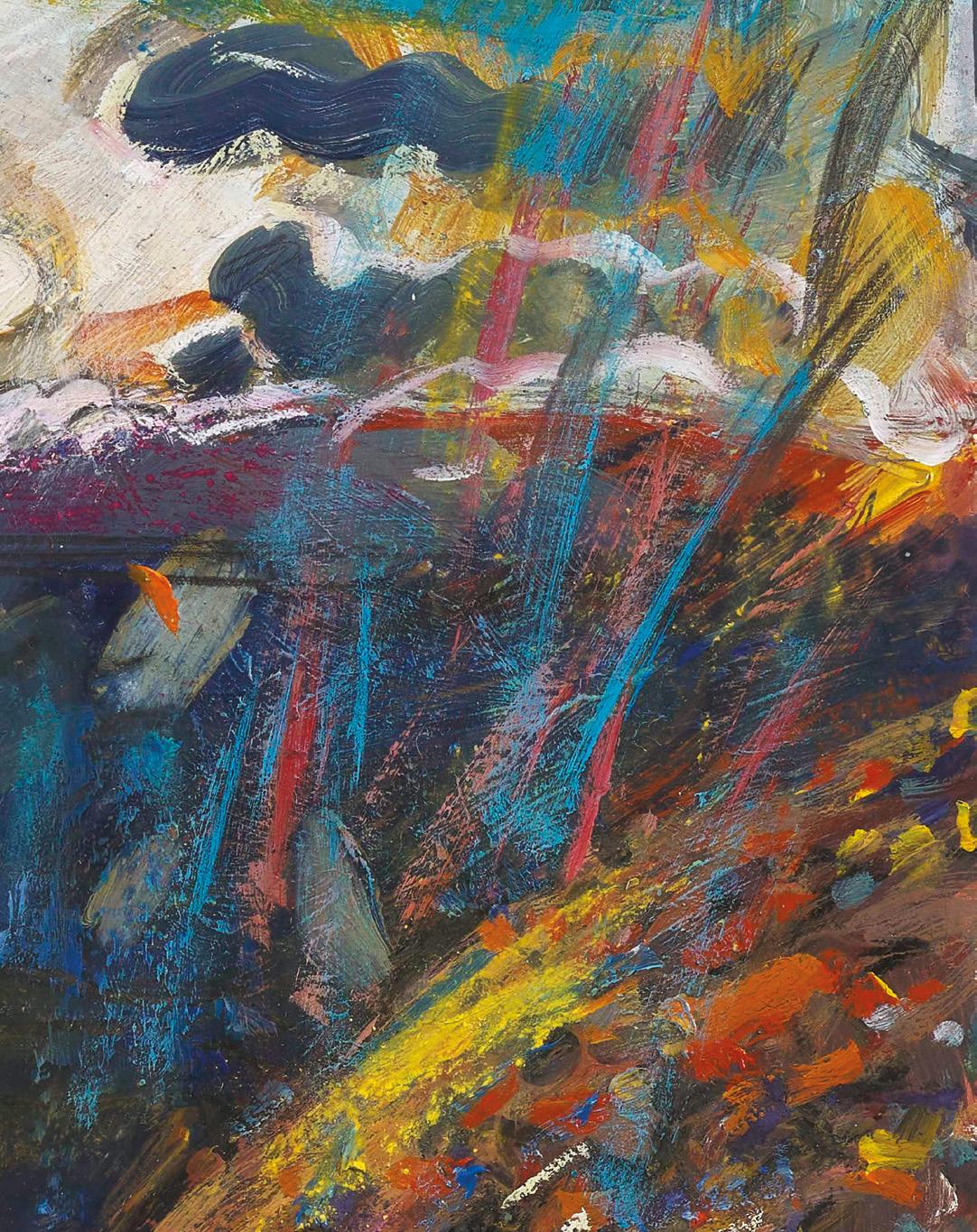 Duncan’s practice is informed by his deep personal connection to the natural world, and his knowledge and appreciation of poetry and music. His work will begin in nature; be that on a hill track or in the garden, his sketchbook recording observations and visual notes to be used and reimagined once back at the easel. He is driven by an overwhelming need to make permanent the moments and happenings he has witnessed in nature. Previous exhibitions of Duncan’s work have focused on the drama of the landscape and the balance between structure and chaos. His exhibition at the Talbot Rice Gallery in 1988 featured the Falls of Clyde as a primary subject. Those works captured water cascading down the high craggy rock-face, crashing like a wall of pure energy against the surface of the painting. The deep wooded glen above Crossford and moving storms on Tinto Hill have also been a rich source of inspiration, in works which crackle with lightning and billowing clouds. The paintings in