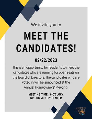 Board applications can be found on our website homepage at www. scottsdaleranch.org or in our office. Board applications are due no later than Tuesday, January 3, 2023 at 5:00 p.m. Candidates will be voted on by the membership and announced at the SRCA Annual Meeting which will be held on Tuesday, March 21, 2023, at 6:00 p.m. at the SRCA Community Center. Visit our website for more detailed information about the SRCA Board of Directors or contact Kathe Barnes, SRCA Executive Director, and she would be more than happy to meet with you and discuss further.