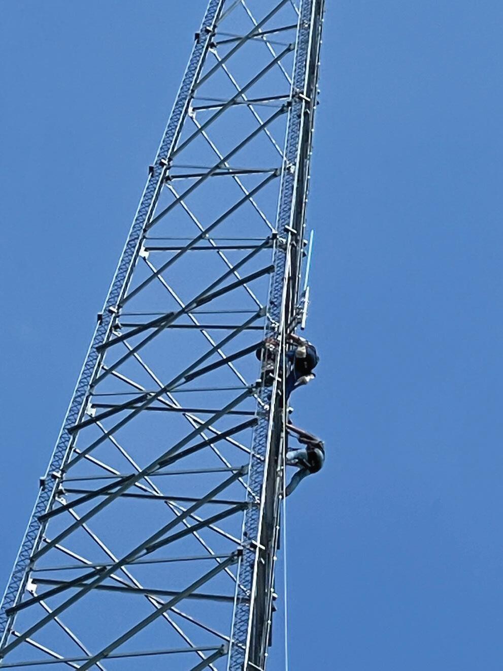 Two workers alternated between climbing for 30 minutes and taking 15-minute breaks, continuing this cycle until the antenna was successfully winched to the top.