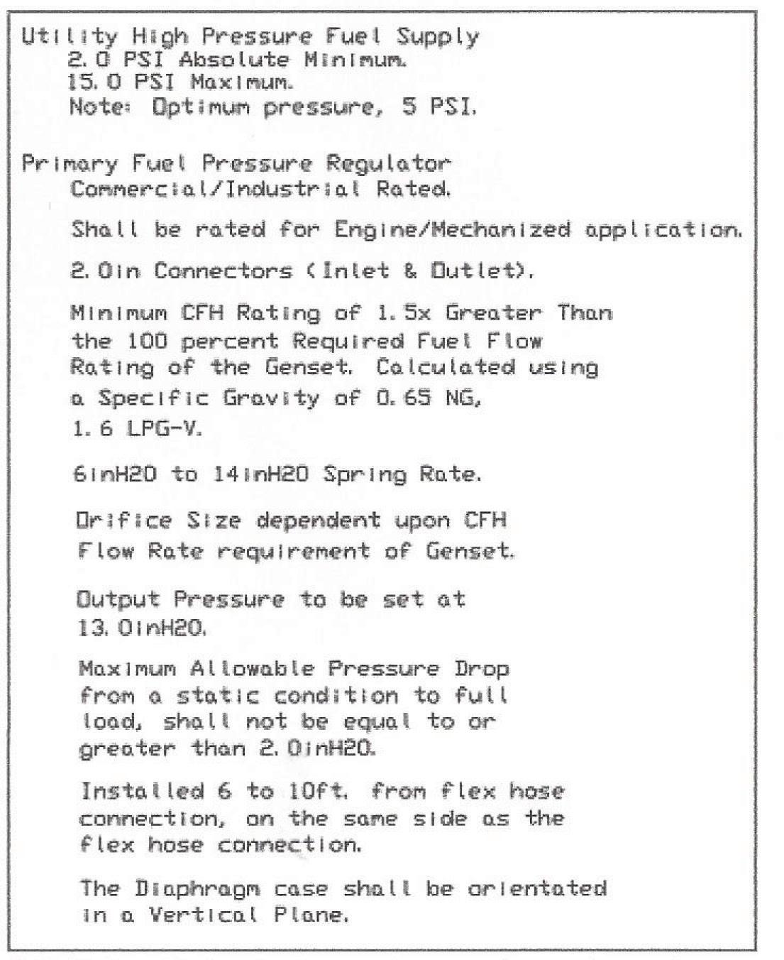 It is important to establish the gas pressure requirements for the generator including minimum and maximum allowable pressures as well as lock up pressure. Because of EPA emissions requirements, many generators require extremely tight pressure control. Normal regulator sizing techniques must be modified because most manufacturers sizing tables are based on 2" w.c. of droop and 3-5" w.c. of lock-up.