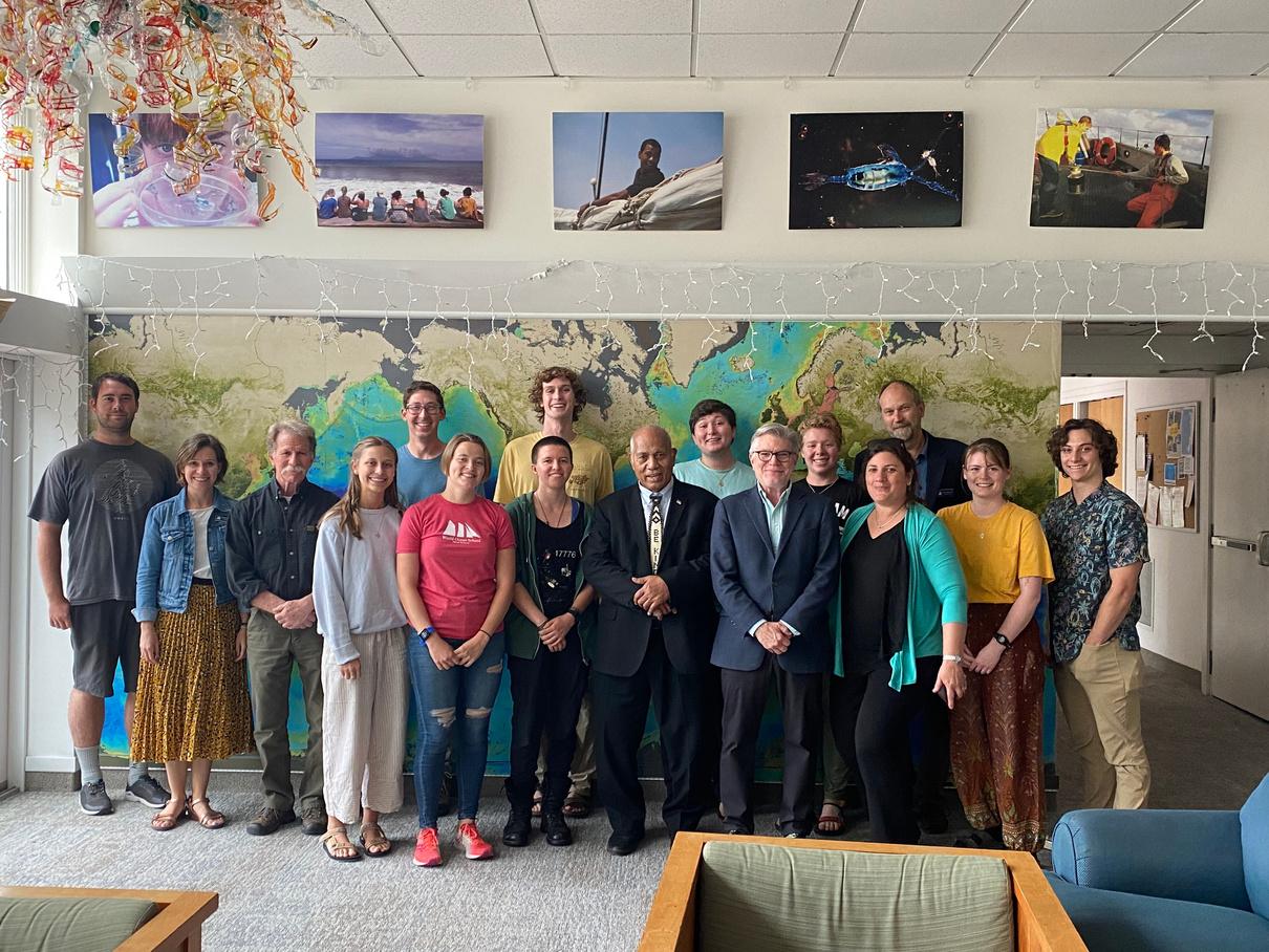 On the 7th of June 2023, only the second full day in Woods Hole for the students of class S’310, the Ambassador to the United States from the Republic of Kiribati walked into the classroom. Although Mr. Teburoro Tito, who was also the former president of Kiribati, was wearing a tie and jacket, his demeanor and tone put the students immediately at ease. The meeting felt more like “a hang-out with a distant relative,” as student Sam Barresi put it. Ambassador Tito sang traditional songs from Kiribati but also had a sing along with a John Denver tune Student Julius Gabelberger presented him with a signed homemade card from everyone, adorned with a painting of a frigatebird, the national bird of his country, and before he was whisked off for various other tours around the campus and on board one of SEA’s ships, the Ambassador managed to make us all feel that our oceanographic research was important and useful that the voyage ahead had a meaning larger than ourselves