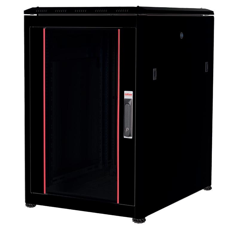 Im Inneren ist ein Paar galvanisierte Profilschienen mit 483 mm (19“) Höheneinheiten verbaut, die zudem in der Tiefe verstellbar sind. Ein weiteres Paar Profilschienen wäre nachrüstbar. Die robuste Stahlkonstruktion besteht aus hochwertigem Stahlblech und ist in Schwarz (RAL 9005) pulverbeschichtet erhältlich.