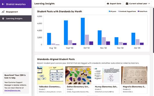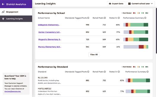 Multi-school group and school-level administrator dashboards provide visibility and actionable insights into pupil performance on standards, engagement, and usage of Seesaw.