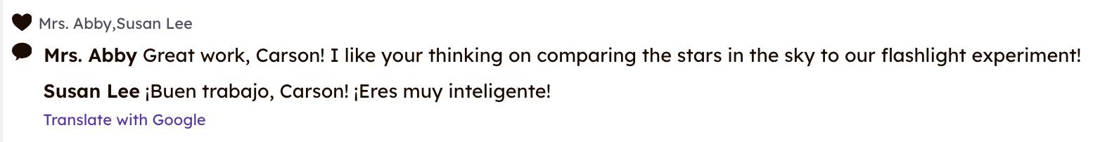 Las familias ven el trabajo en tiempo real desde cualquier dispositivo. La comunicación inclusiva bidireccional con traducción automática a más de 100 idiomas del hogar ayuda a mantener a cada familia en el ciclo de aprendizaje.