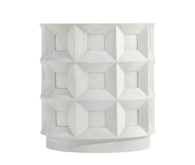 Cast glass-reinforced concrete with dimensional pattern on sides. Plinth base. Buff finish.