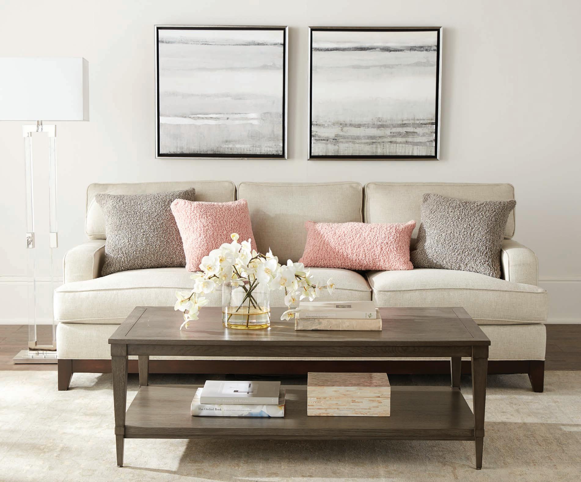 HERE, A FORMAL SOFA WITH A SLEEK WOOD BASE AND A NEOCLASSICAL-INSPIRED OAK TABLE ARE MADE WELCOMING BY DESIGNER-SELECTED ACCENTS LIKE PASTEL PILLOWS AND ABSTRACT LANDSCAPE ARTWORK.