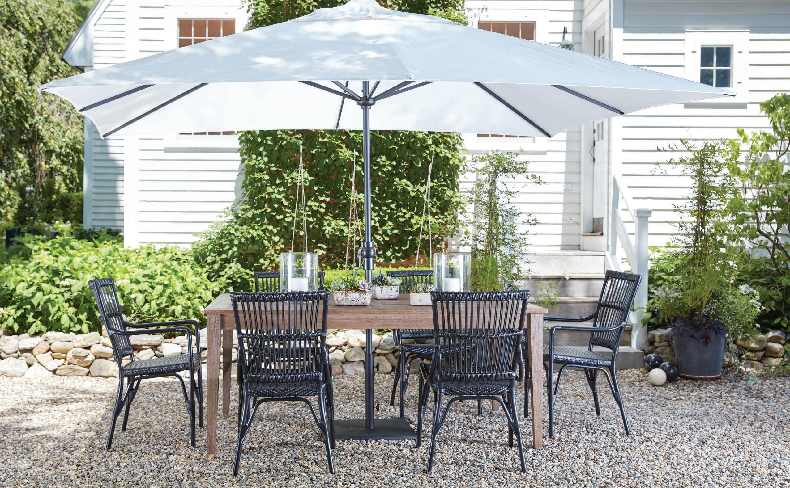 TIMELESS TEAK. MODERN BLACK WICKER. INTERIOR DESIGNERS CAN TURN CONTRASTING MATERIALS INTO A BACKYARD HAVEN FOR ENTERTAINING.