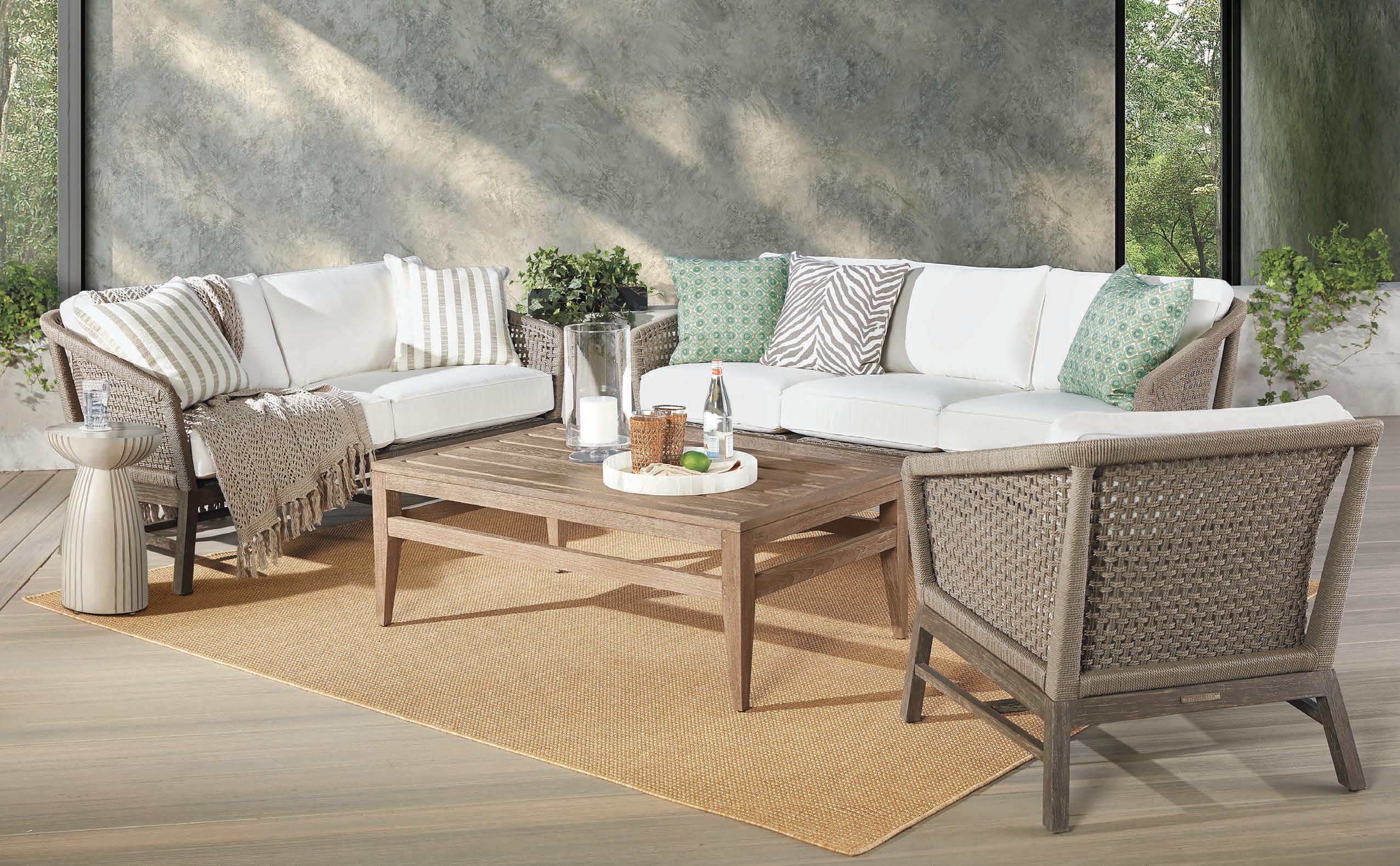USING RESORT-INSPIRED SEATING, CRAFTED FROM TEAK AND WEATHER-RESISTANT ROPE, AN INTERIOR DESIGNER MAKES ANY PATIO THE PERFECT SPOT FOR CATCHING EVERY SUNSET.