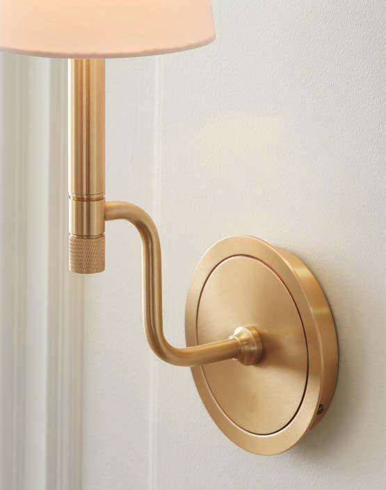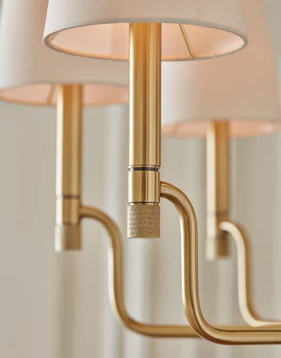 IT ’ S A LITTLE BIT MODERN—ANTIQUED FINISH, KNURLED STEM DETAILS— WITH A CLASSIC SHADE THAT GIVES IT UNMISTAKABLE FORMAL FLAIR. COORDINATE YOUR CHANDELIER, WALL SCONCE, AND TABLE LAMP OPTIONS FOR A COHESIVE AND DAZZLING EFFECT.