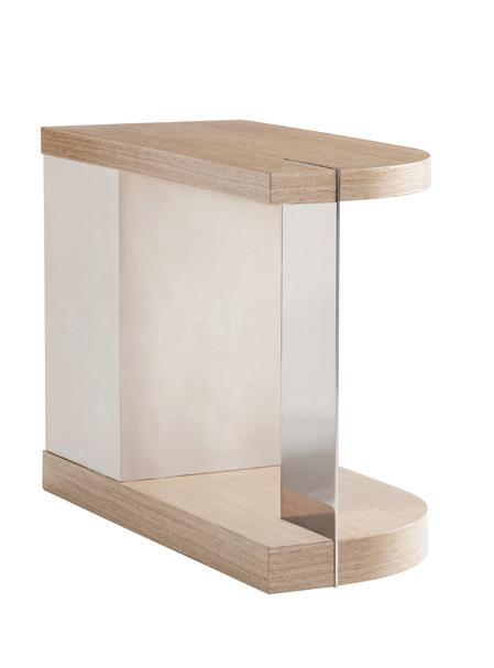Veneered table in Sahara finish with top and shelf rounded on one corner, and rectangular base. One vertical wood panel and one vertical Polished Stainless Steel panel on opposite ends. Anti-tip kit.