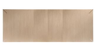 Sahara finish on wood table top and two 20" leaves. Four Polished Stainless Steel legs set in at 45 degree angle.