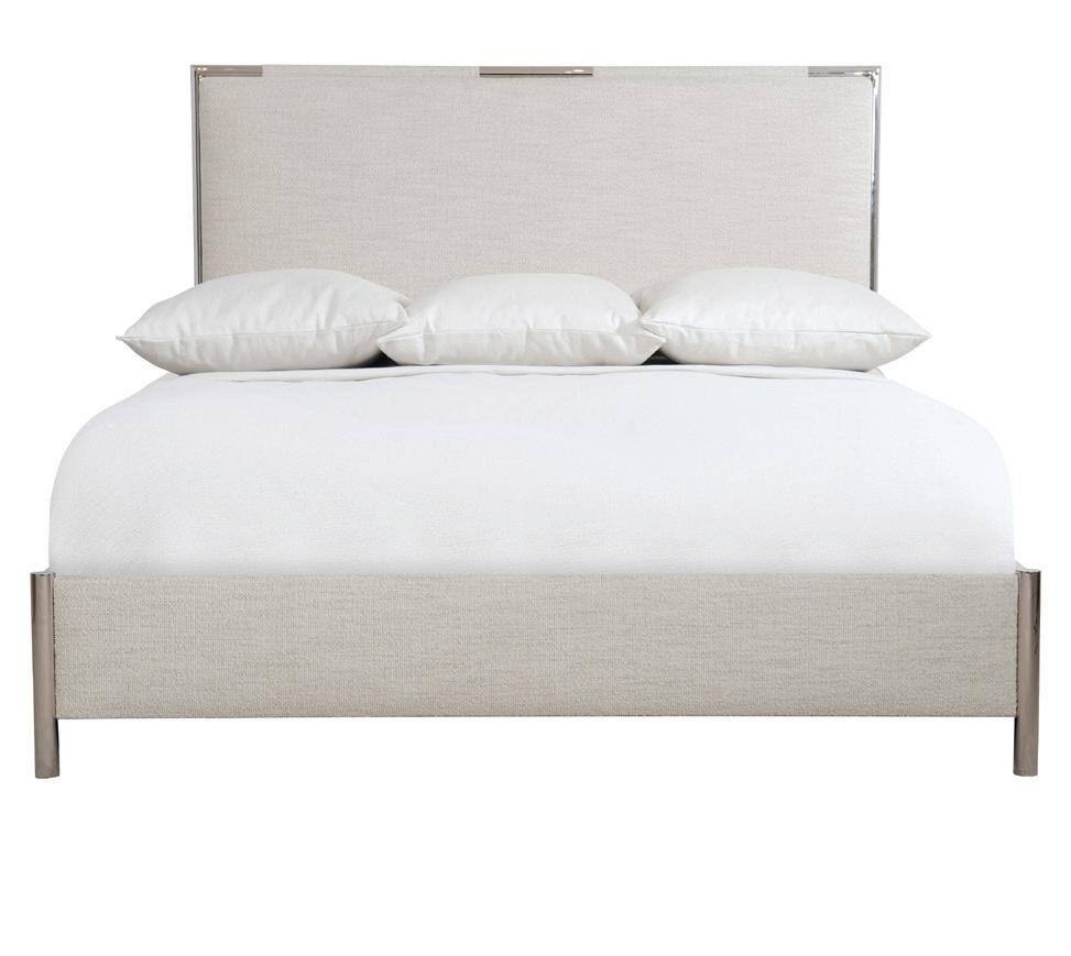 Polished Stainless Steel frame with upholstered headboard panel with center seam and two fabric sleeves that wrap over the top metal rail. Upholstered side rails. Upholstered footboard panel with stainless steel posts. Five wood slats with adjustable double support. Headboard cannot be used alone. Must be ordered with footboard/side rails.
