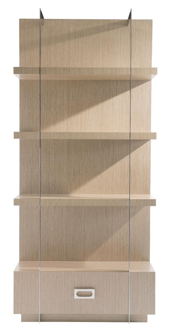 Ash solids and engineered veneers with faux stone accents and polished stainless steel frames, accents and hardware.