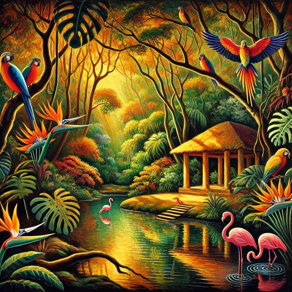 A tropical-themed gym 1000m2 set in a glassenclosed greenhouse, filled with lush green plants. The layout has been rearranged with distinct workout zones. Treadmills and stationary bikes are placed near the windows for a scenic view. Weight benches and dumbbells are positioned in the center for strength training. Yoga mats and stretching areas are moved to the far side of the room for a peaceful corner. Lush plants surround all zones, and natural light fills the space. The polished wood floor and hanging plants add to the fresh, airy, and motivating atmosphere.