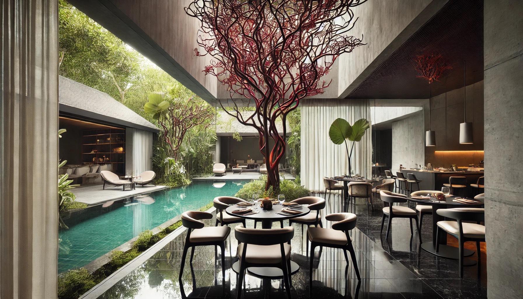 An exclusive small gourmet restaurant overlooking the large pool. The restaurant features minimalistic designer furniture, including sleek tables and chairs in neutral tones. The layout maintains the unique tree-like structures with red branches and greenery, blending them into the dining experience. The furniture is modern and understated, with clean lines and a focus on elegance and functionality. Large windows and soft lighting create an intimate and luxurious atmosphere, while the natural elements enhance the space, making it feel contemporary