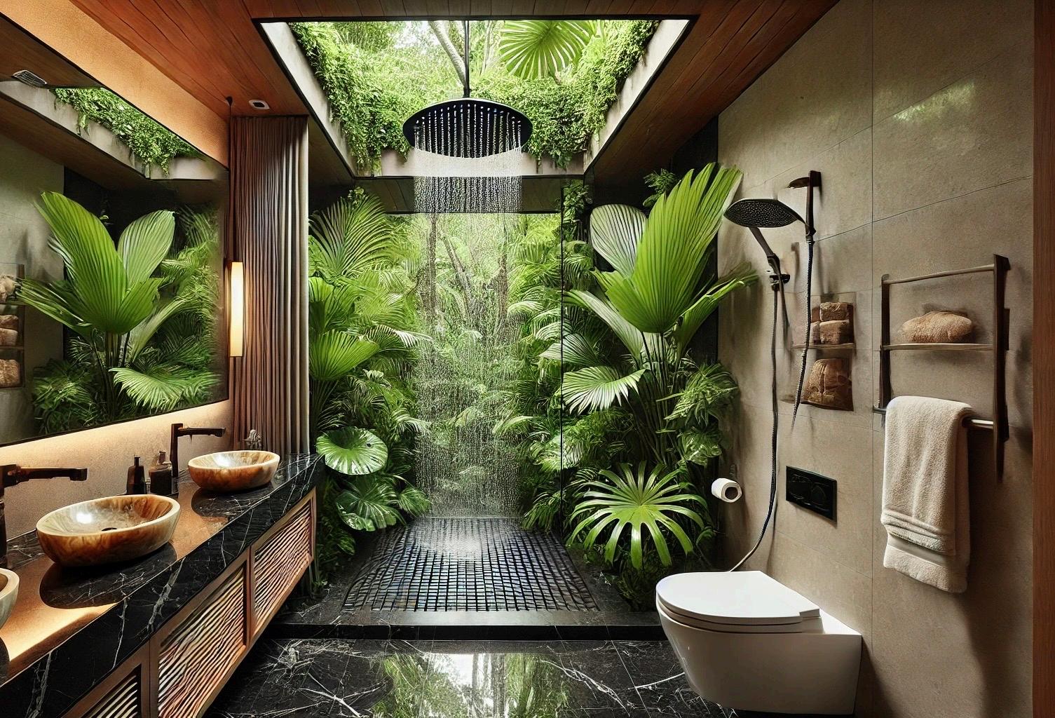 Step into a tranquil tropical oasis where luxury meets nature. This spacious ensuite bathroom features an oversized rain shower draped with live tropical plants, offering an immersive, serene experience. The sleek black marble fl ooring complements the double ONYX sinks, while elegant marble finishes and large mirrors reflect the surrounding greenery. This open-plan bathroom seamlessly blends modern design with the beauty of nature, creating a sanctuary for relaxation and rejuvenation.