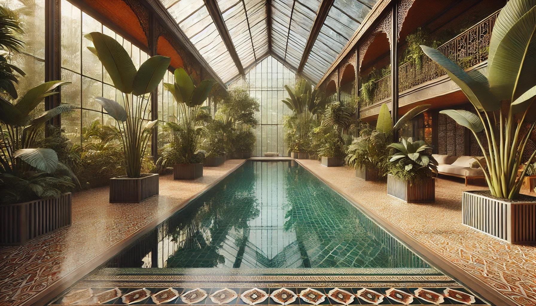 A luxurious 600m2indoor pool set within a tropical greenhouse environment. The pool is rectangular with smooth edges and surrounded by lush tropical plants like palms and large leafy greenery. Glass walls and a high, transparent roof allow natural light to flood the area, casting reflections on the wet tiled floor. The tile pattern is intricate with earthy tones and small white accents, adding to the elegance. A warm, tranquil atmosphere with natural colors and a high-end, exotic feel.