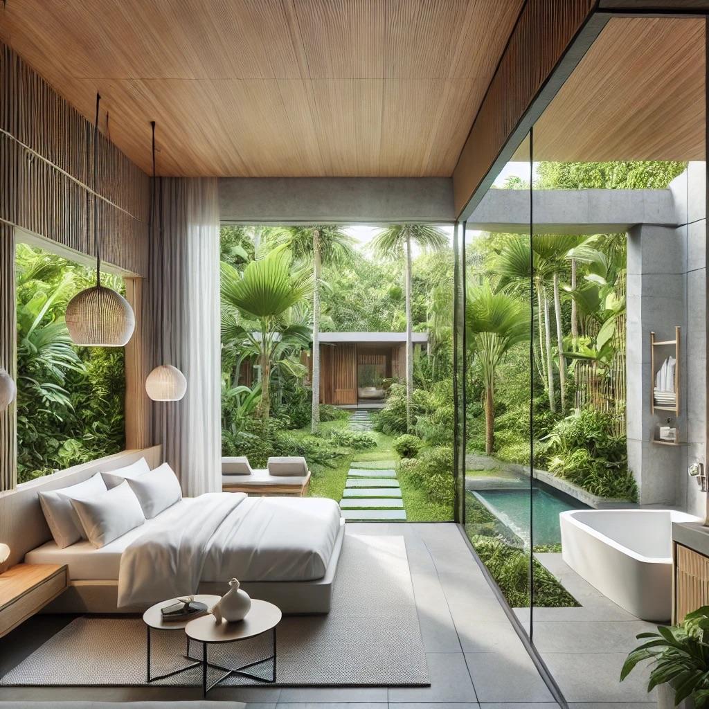 The image showcases a luxurious “Park View Room,” blending modern architecture with a lush tropical environment. Floor-to-ceiling glass windows open up to a vibrant garden, featuring tall palms and exotic greenery, creating a seamless indoor-outdoor connection. The spacious room is tastefully designed with minimalist furniture, including a cozy bed and hanging pendant lights. It offers a tranquil view of the garden. Natural wood tones and soft lighting complement the peaceful ambiance, making this space an ideal retreat in a tropical paradise.