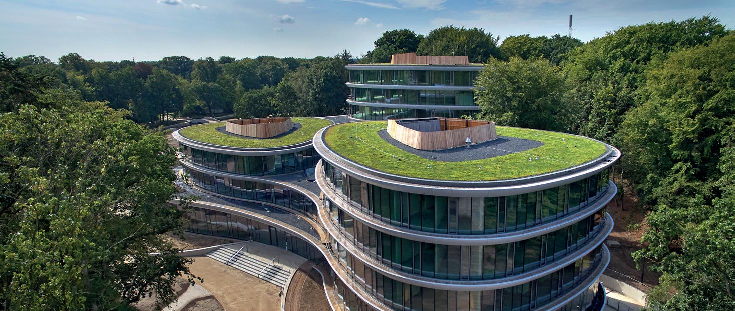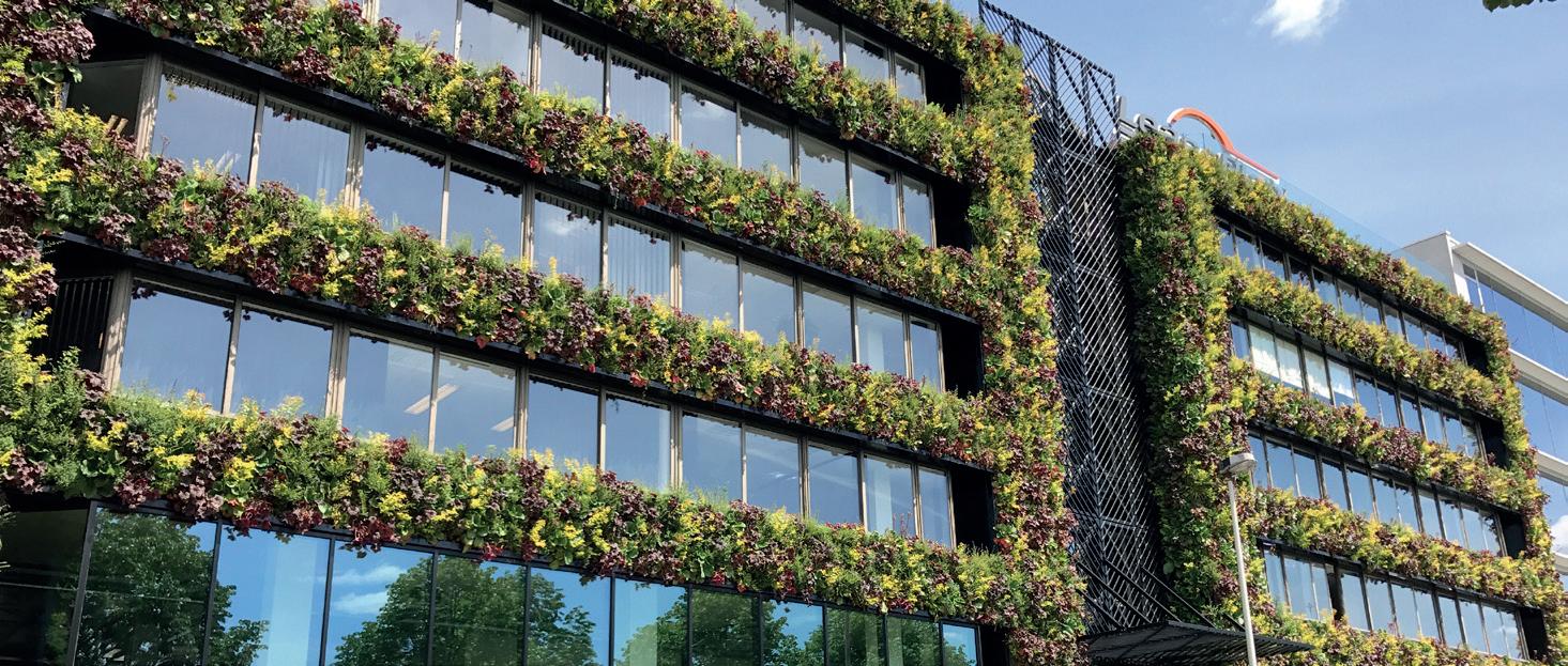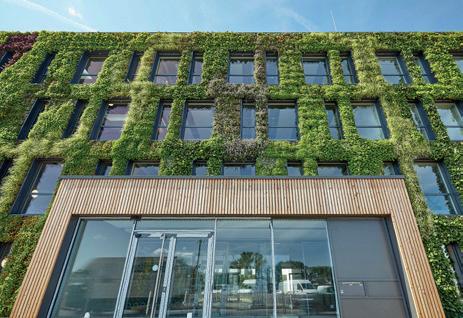 Groene gevels fungeren als geluidsbarrière voor het gebouw.
