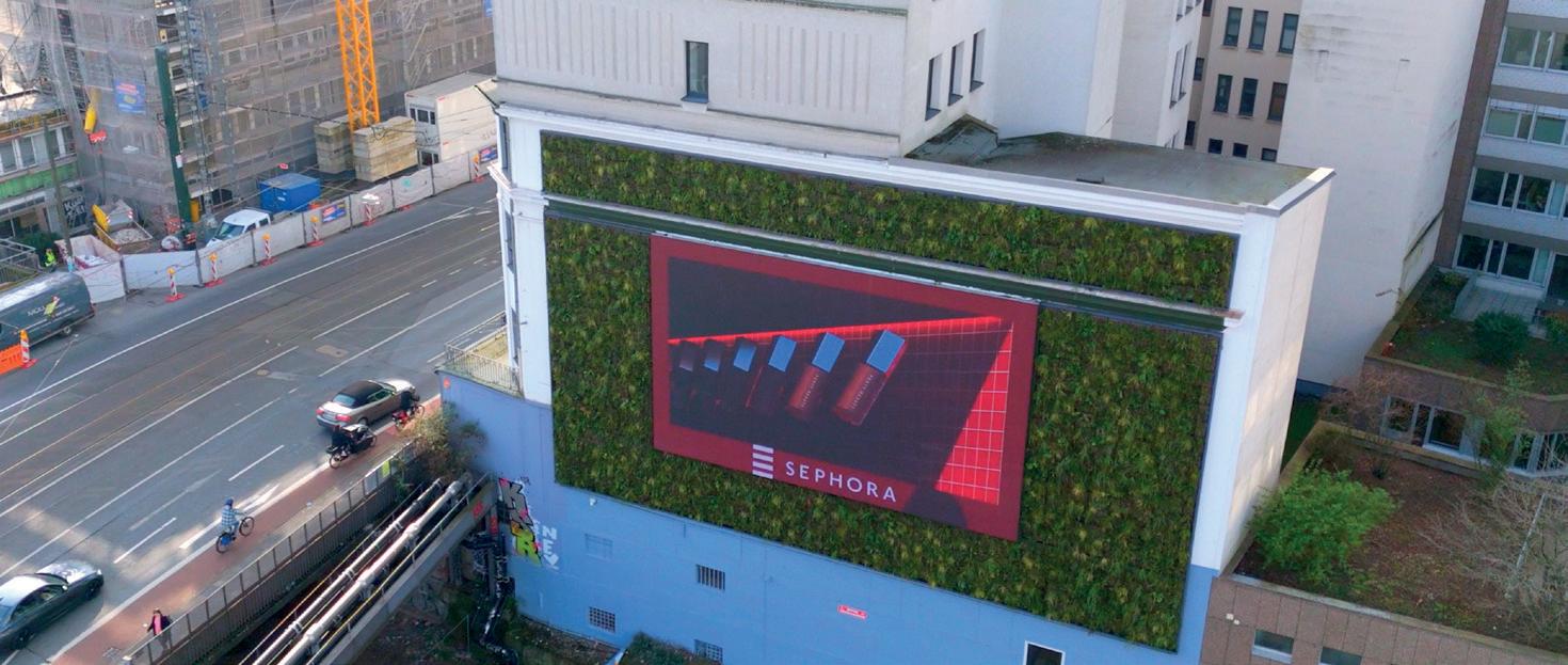Op een prominente plaats langs de drukke S-Bahn Am Wehrhahn in het centrum van Düsseldorf kun je sinds kort je groene hart ophalen. Na een eerdere samenwerking met blowUP media Germany, expert in grootformaat buitenreclame, heeft Sempergreen hier in opdracht van LEDCON Systems GmbH nu een tweede SemperGreenwall voor blowUP media Germany rondom een LED video wall geïnstalleerd. Dit renovatieproject, genaamd “The Green Digital”, bestaat uit een enorm digitaal scherm van 100 m², dat door zonneenergie wordt aangedreven. Het scherm is omlijst door een florerende groene gevel van maar liefst 180 m² groot. Deze gevelrenovatie zorgt letterlijk voor verademing voor de voorbijgangers op dit drukke verkeersknooppunt in de stad en de daaruit voortvloeiende luchtverontreiniging.