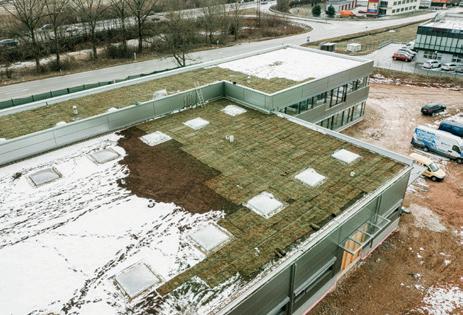 De hele installatie duurde slechts zeven dagen. Platte daken zijn perfect voor groendaken, waarbij gebruik wordt gemaakt van een gelaagd systeem: drainage met filtervlies, extensief substraat en voorgegroeide vegetatiematten. Deze Sedummixmatten - beplant met 6 tot 8 soorten Sedum - zijn eenvoudig uit te rollen en bieden een dekking van 95% bij levering, waardoor een direct groen resultaat gegarandeerd is.