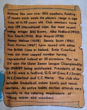 Next day Florence, Daphne and Yvonne arrived just as Mickey was starting the evening milking. Florence handed him what she said was a special tea towel from Malone Rugby Football Club of Gibson Park in Belfast and handed me an embroidery kit that she had never got started on for use in any future classes that might come my way. According to the tea towel Florence’s late Husband Ernie Crawford was the most capped member having represented Ireland on 30 occasions, and I demonstrated stitches on the embroidery kit in classes many times. As a crafter I have had the pleasure of meeting some kind, interesting and very generous people. Shown here are photos of the tea towel and the unfinished embroidery kit.